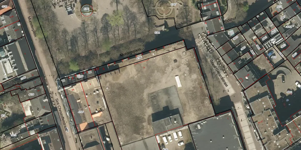 Het perceel waarop Munsterplein 11 staat heeft een oppervlakte van 4343 m². Dit is een zeer groot perceel. De perceeloppervlakte wordt geregistreerd door het Kadaster. Gedetailleerde informatie over de maten van dit perceel kunt u vinden in het rapport Kadastrale kaart met maatvoering van Munsterplein 11.