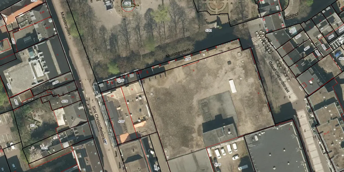 Het perceel waarop Munsterplein 11-A staat heeft een oppervlakte van 4343 m². Dit is een zeer groot perceel. De perceeloppervlakte wordt geregistreerd door het Kadaster. Gedetailleerde informatie over de maten van dit perceel kunt u vinden in het rapport Kadastrale kaart met maatvoering van Munsterplein 11-A.