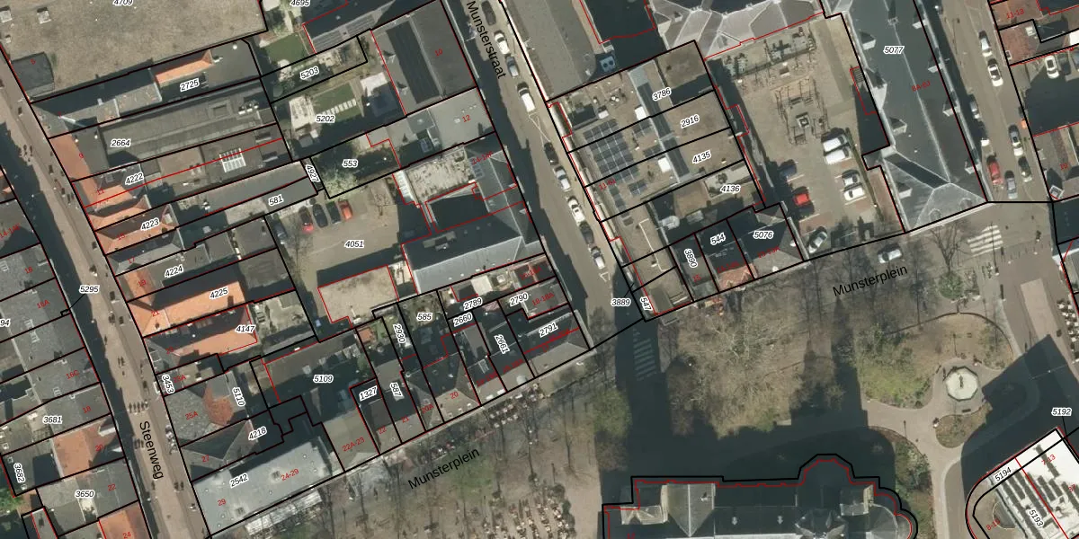 Het perceel waarop Munsterstraat 16 staat heeft een oppervlakte van 116 m². Dit is een middelgroot perceel. De perceeloppervlakte wordt geregistreerd door het Kadaster. Gedetailleerde informatie over de maten van dit perceel kunt u vinden in het rapport Kadastrale kaart met maatvoering van Munsterstraat 16.
