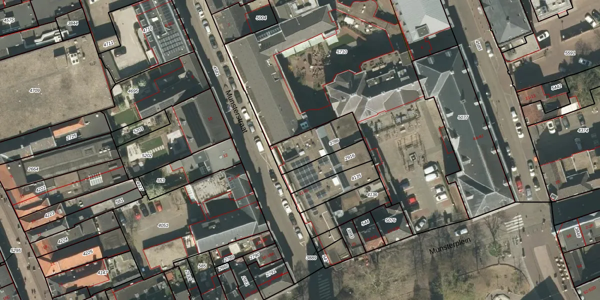 Munsterstraat 55 is gelegen op kadastraal perceel RMD00D3786. Deze kadastrale aanduiding is uniek en wordt gebruikt door het Kadaster om eigendomsrechten en andere zakelijke rechten vast te leggen. Het perceel maakt onderdeel uit van de kadastrale gemeente Roermond.