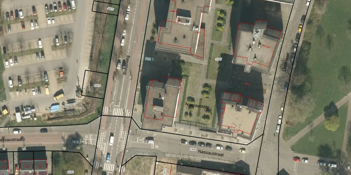 Het perceel waarop Nassaustate 18 staat heeft een oppervlakte van 9102 m². Dit is een zeer groot perceel. De perceeloppervlakte wordt geregistreerd door het Kadaster. Gedetailleerde informatie over de maten van dit perceel kunt u vinden in het rapport Kadastrale kaart met maatvoering van Nassaustate 18.