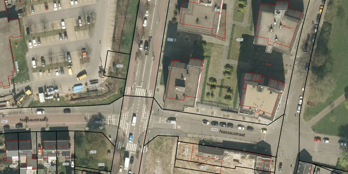 Het perceel waarop Nassaustate 20 staat heeft een oppervlakte van 9102 m². Dit is een zeer groot perceel. De perceeloppervlakte wordt geregistreerd door het Kadaster. Gedetailleerde informatie over de maten van dit perceel kunt u vinden in het rapport Kadastrale kaart met maatvoering van Nassaustate 20.