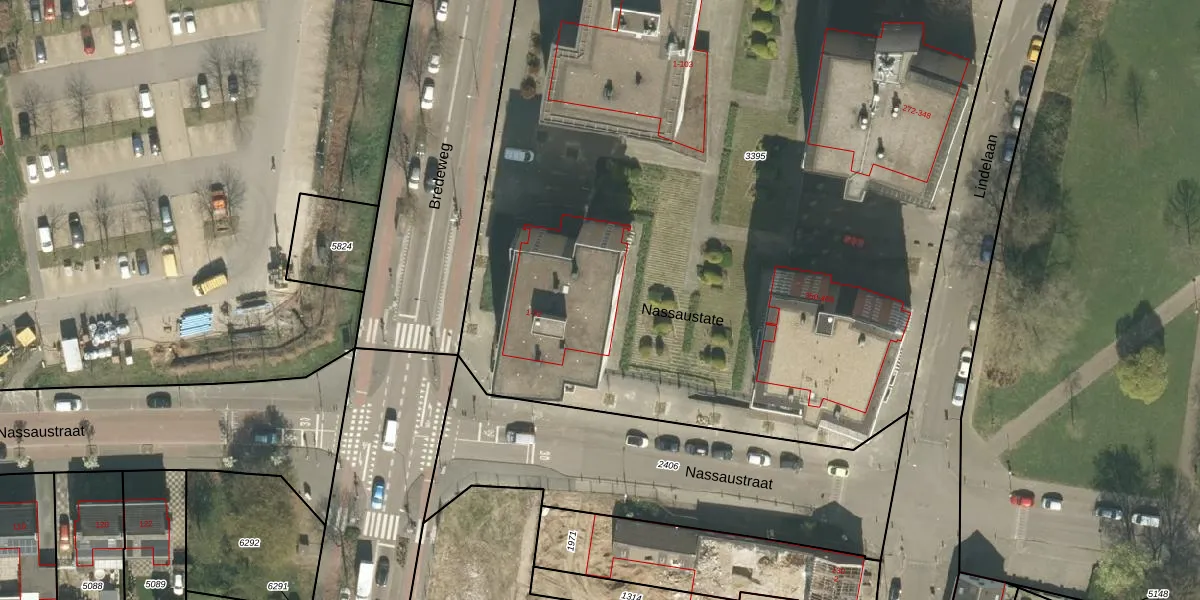 Het perceel waarop Nassaustate 5 staat heeft een oppervlakte van 9102 m². Dit is een zeer groot perceel. De perceeloppervlakte wordt geregistreerd door het Kadaster. Gedetailleerde informatie over de maten van dit perceel kunt u vinden in het rapport Kadastrale kaart met maatvoering van Nassaustate 5.