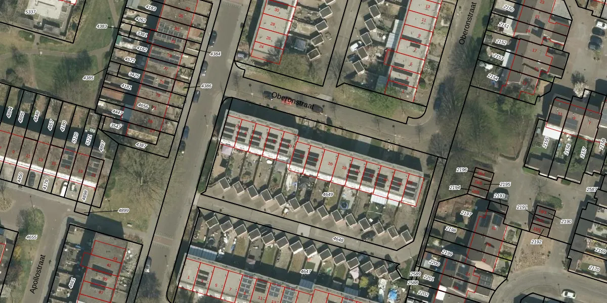 Het perceel waarop Oberonstraat 12 staat heeft een oppervlakte van 2365 m². Dit is een zeer groot perceel. De perceeloppervlakte wordt geregistreerd door het Kadaster. Gedetailleerde informatie over de maten van dit perceel kunt u vinden in het rapport Kadastrale kaart met maatvoering van Oberonstraat 12.