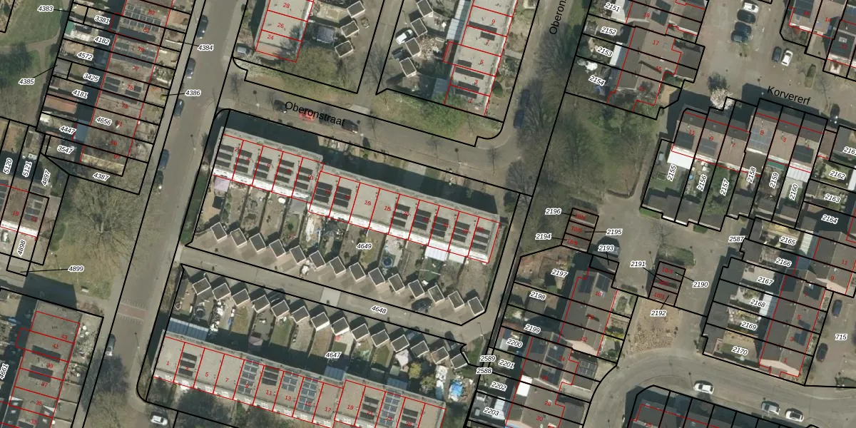 Het perceel waarop Oberonstraat 22 staat heeft een oppervlakte van 2365 m². Dit is een zeer groot perceel. De perceeloppervlakte wordt geregistreerd door het Kadaster. Gedetailleerde informatie over de maten van dit perceel kunt u vinden in het rapport Kadastrale kaart met maatvoering van Oberonstraat 22.