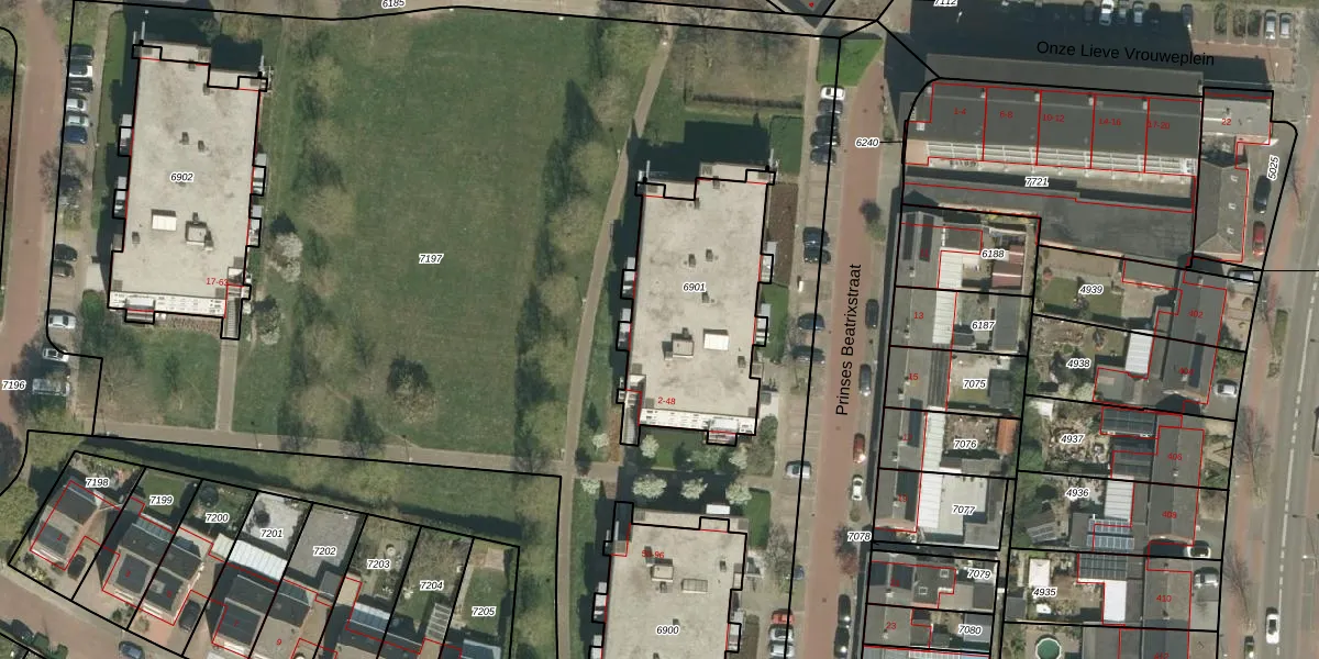 Prinses Beatrixstraat 32 is gelegen op kadastraal perceel RMD00B6901. Deze kadastrale aanduiding is uniek en wordt gebruikt door het Kadaster om eigendomsrechten en andere zakelijke rechten vast te leggen. Het perceel maakt onderdeel uit van de kadastrale gemeente Roermond.