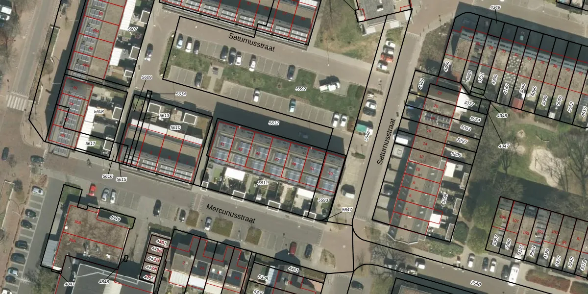 Saturnusstraat 49 is gelegen op kadastraal perceel RMD00F5611. Deze kadastrale aanduiding is uniek en wordt gebruikt door het Kadaster om eigendomsrechten en andere zakelijke rechten vast te leggen. Het perceel maakt onderdeel uit van de kadastrale gemeente Roermond.