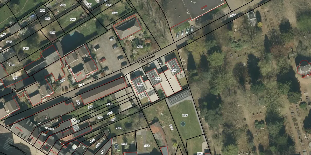 Schoolpad 12 is gelegen op kadastraal perceel RMD00B8448. Deze kadastrale aanduiding is uniek en wordt gebruikt door het Kadaster om eigendomsrechten en andere zakelijke rechten vast te leggen. Het perceel maakt onderdeel uit van de kadastrale gemeente Roermond.