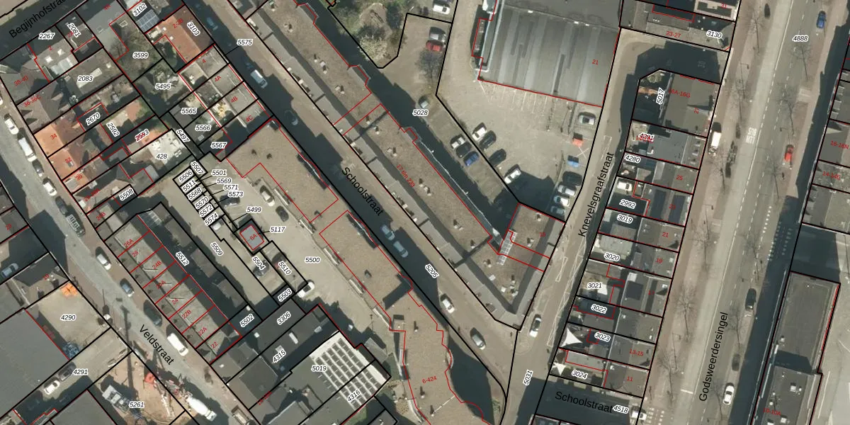 Schoolstraat 117 is gelegen op kadastraal perceel RMD00D5028. Deze kadastrale aanduiding is uniek en wordt gebruikt door het Kadaster om eigendomsrechten en andere zakelijke rechten vast te leggen. Het perceel maakt onderdeel uit van de kadastrale gemeente Roermond.