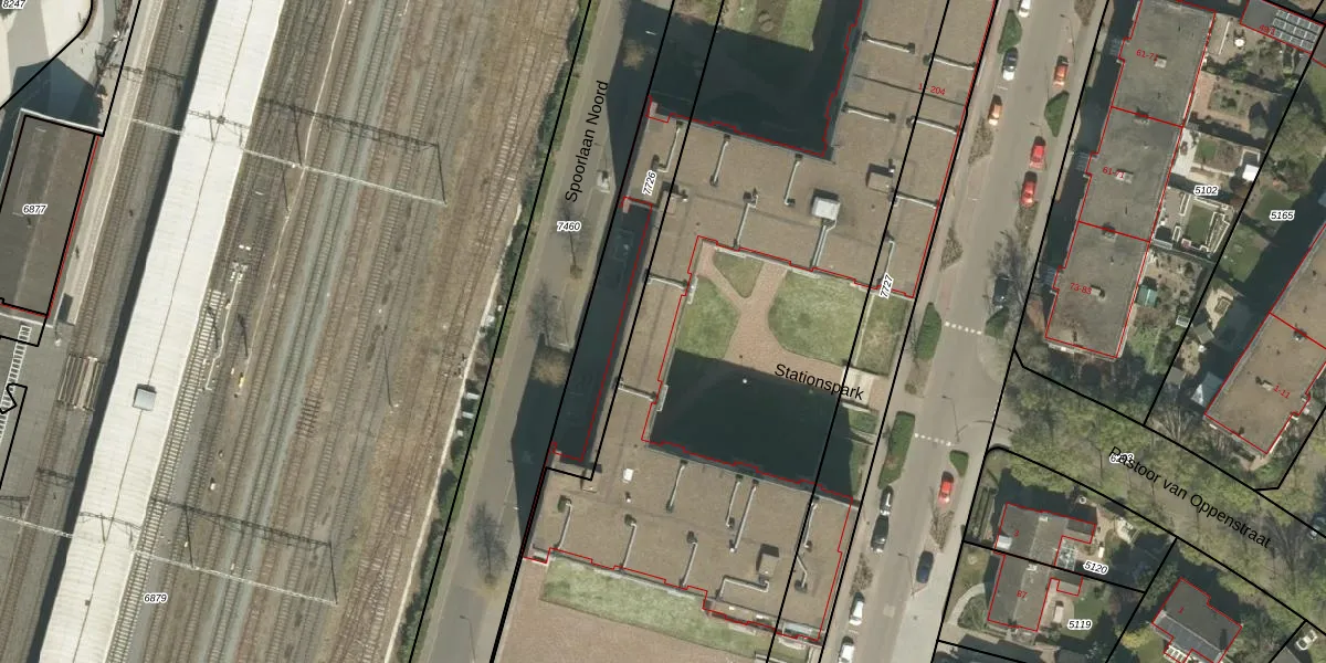 Het perceel waarop Stationspark 55 staat heeft een oppervlakte van 7342 m². Dit is een zeer groot perceel. De perceeloppervlakte wordt geregistreerd door het Kadaster. Gedetailleerde informatie over de maten van dit perceel kunt u vinden in het rapport Kadastrale kaart met maatvoering van Stationspark 55.
