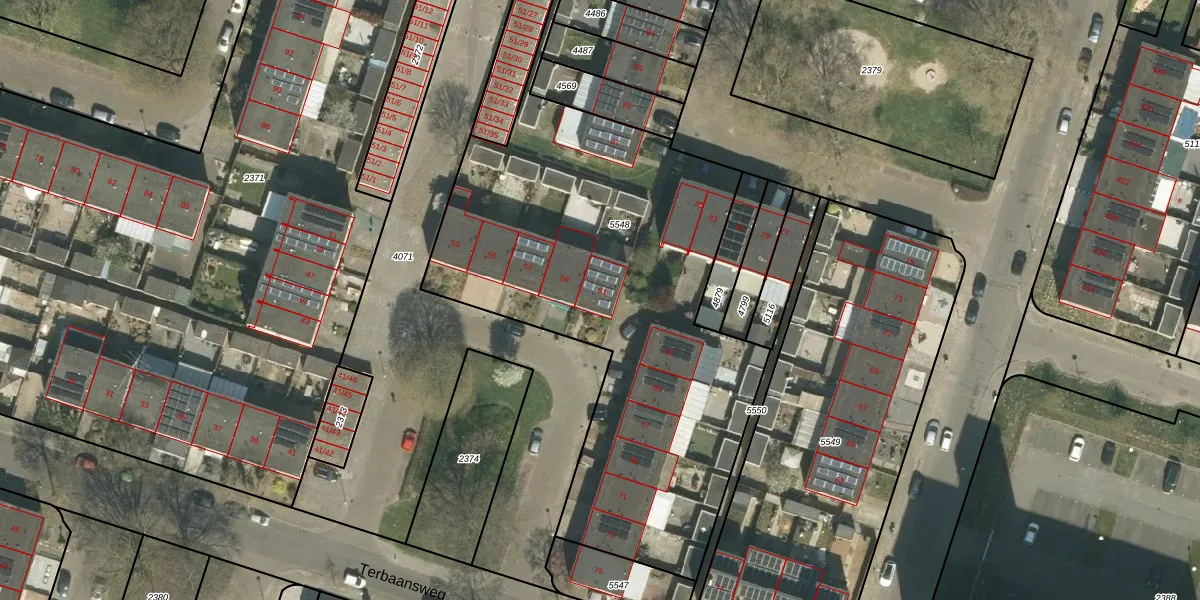 Het perceel waarop Terbaansweg 61 staat heeft een oppervlakte van 3042 m². Dit is een zeer groot perceel. De perceeloppervlakte wordt geregistreerd door het Kadaster. Gedetailleerde informatie over de maten van dit perceel kunt u vinden in het rapport Kadastrale kaart met maatvoering van Terbaansweg 61.