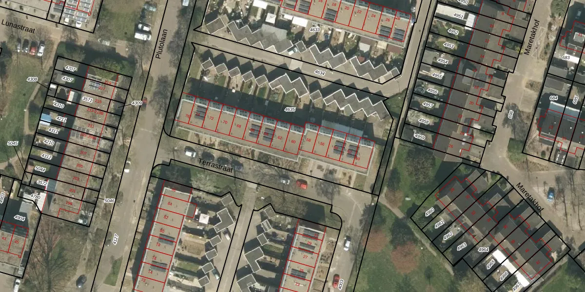 Terrastraat 60 is gelegen op kadastraal perceel RMD00F4635. Deze kadastrale aanduiding is uniek en wordt gebruikt door het Kadaster om eigendomsrechten en andere zakelijke rechten vast te leggen. Het perceel maakt onderdeel uit van de kadastrale gemeente Roermond.