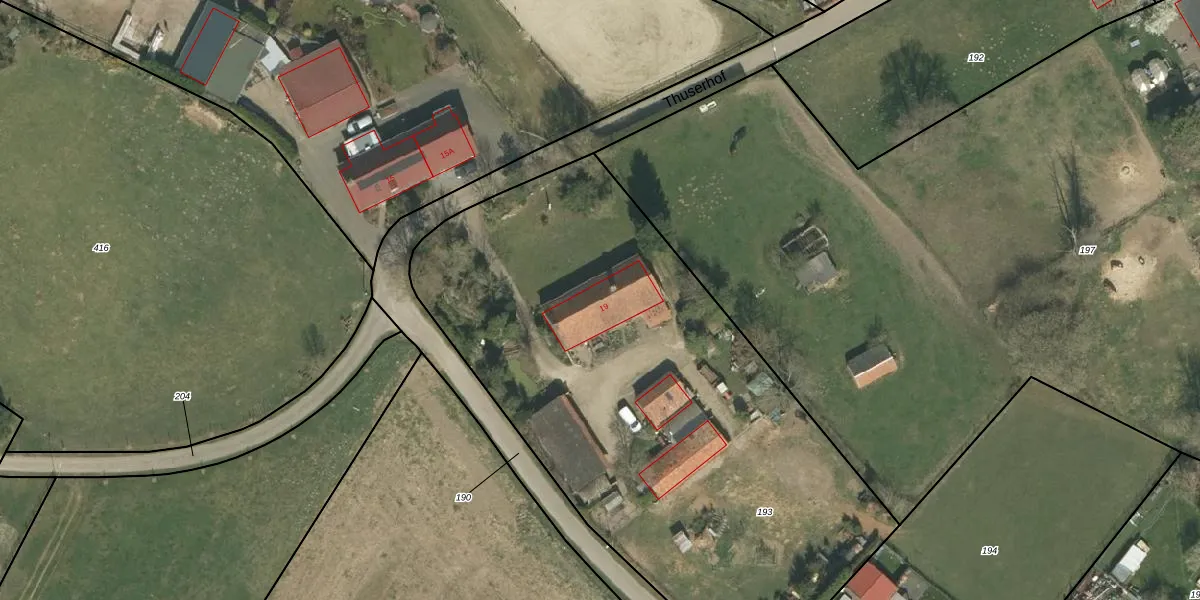 Het perceel waarop Thuserhof 19 staat heeft een oppervlakte van 3367 m². Dit is een zeer groot perceel. De perceeloppervlakte wordt geregistreerd door het Kadaster. Gedetailleerde informatie over de maten van dit perceel kunt u vinden in het rapport Kadastrale kaart met maatvoering van Thuserhof 19.