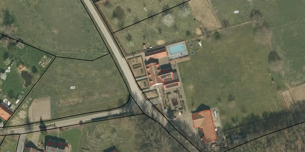 Het perceel waarop Thuserhof 25 staat heeft een oppervlakte van 1,5 ha. Dit is een zeer groot perceel. De perceeloppervlakte wordt geregistreerd door het Kadaster. Gedetailleerde informatie over de maten van dit perceel kunt u vinden in het rapport Kadastrale kaart met maatvoering van Thuserhof 25.