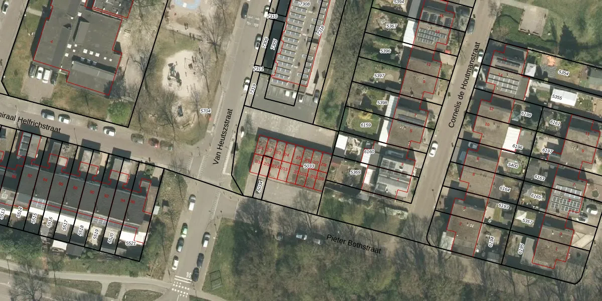 Het perceel waarop Van Heutszstraat 2-5 staat heeft een oppervlakte van 860 m². Dit is een groot perceel. De perceeloppervlakte wordt geregistreerd door het Kadaster. Gedetailleerde informatie over de maten van dit perceel kunt u vinden in het rapport Kadastrale kaart met maatvoering van Van Heutszstraat 2-5.