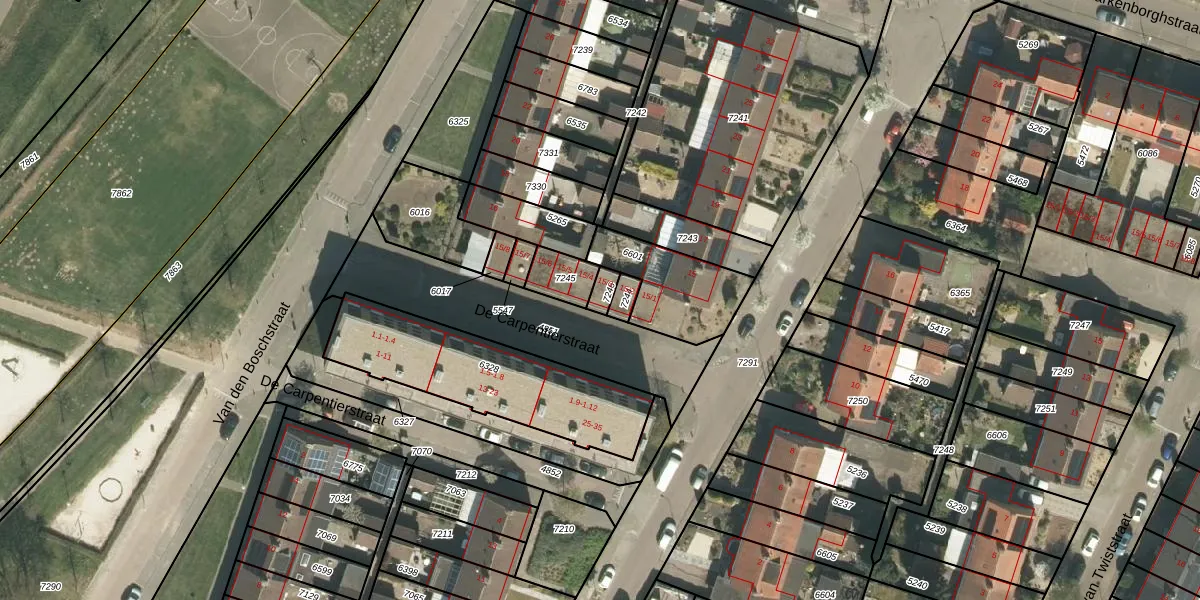 Gebruik de zoekbalk of klik op een perceel voor informatie over de adressen binnen dit perceel.