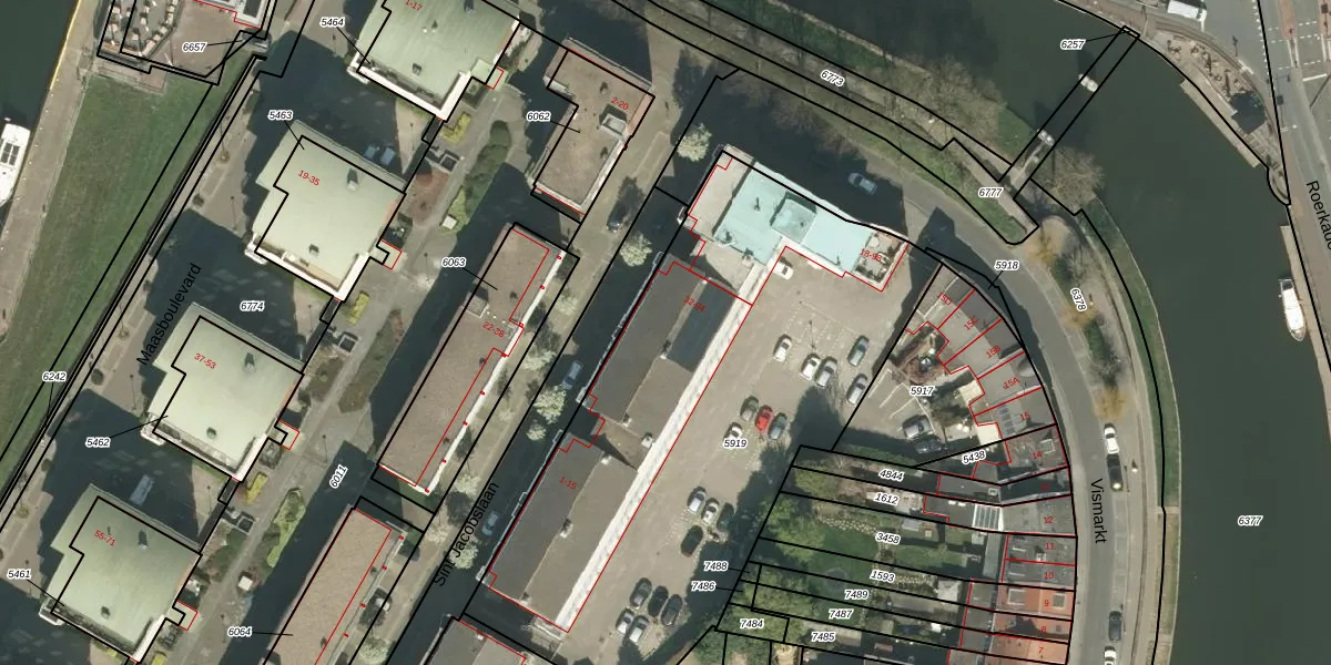 Het perceel waarop Vismarkt 34 staat heeft een oppervlakte van 2753 m². Dit is een zeer groot perceel. De perceeloppervlakte wordt geregistreerd door het Kadaster. Gedetailleerde informatie over de maten van dit perceel kunt u vinden in het rapport Kadastrale kaart met maatvoering van Vismarkt 34.