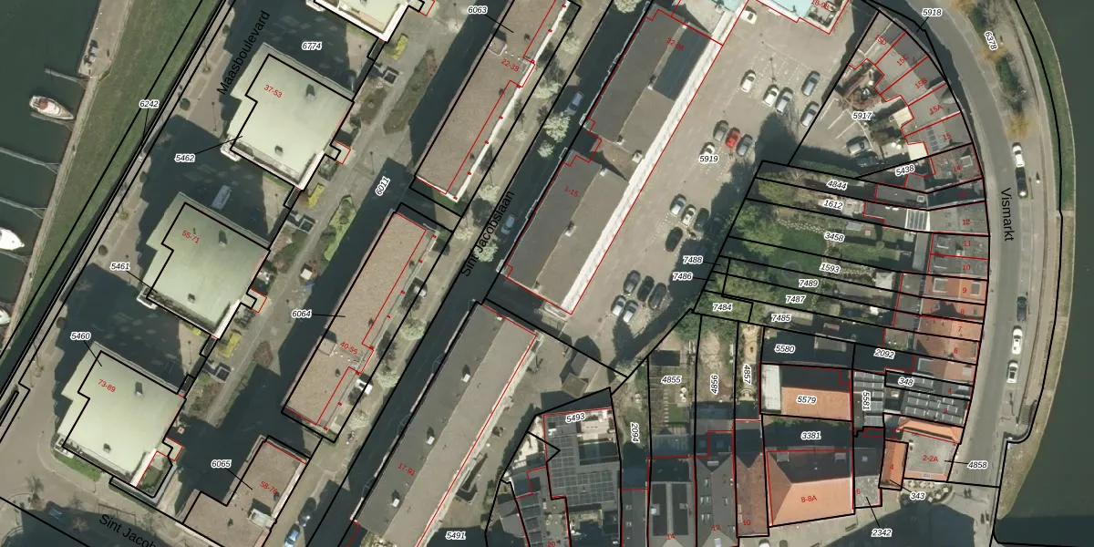 Het perceel waarop Vismarkt 74 staat heeft een oppervlakte van 2753 m². Dit is een zeer groot perceel. De perceeloppervlakte wordt geregistreerd door het Kadaster. Gedetailleerde informatie over de maten van dit perceel kunt u vinden in het rapport Kadastrale kaart met maatvoering van Vismarkt 74.