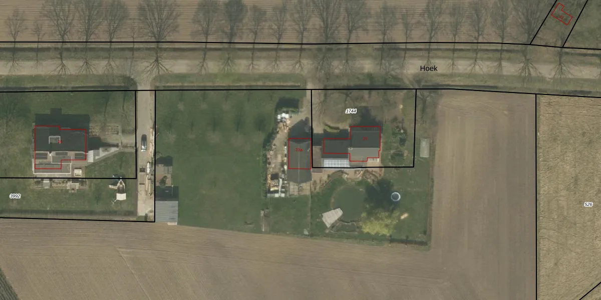 Het perceel waarop Hoek 23-a staat heeft een oppervlakte van 2,2 ha. Dit is een zeer groot perceel. De perceeloppervlakte wordt geregistreerd door het Kadaster. Gedetailleerde informatie over de maten van dit perceel kunt u vinden in het rapport Kadastrale kaart met maatvoering van Hoek 23-a.