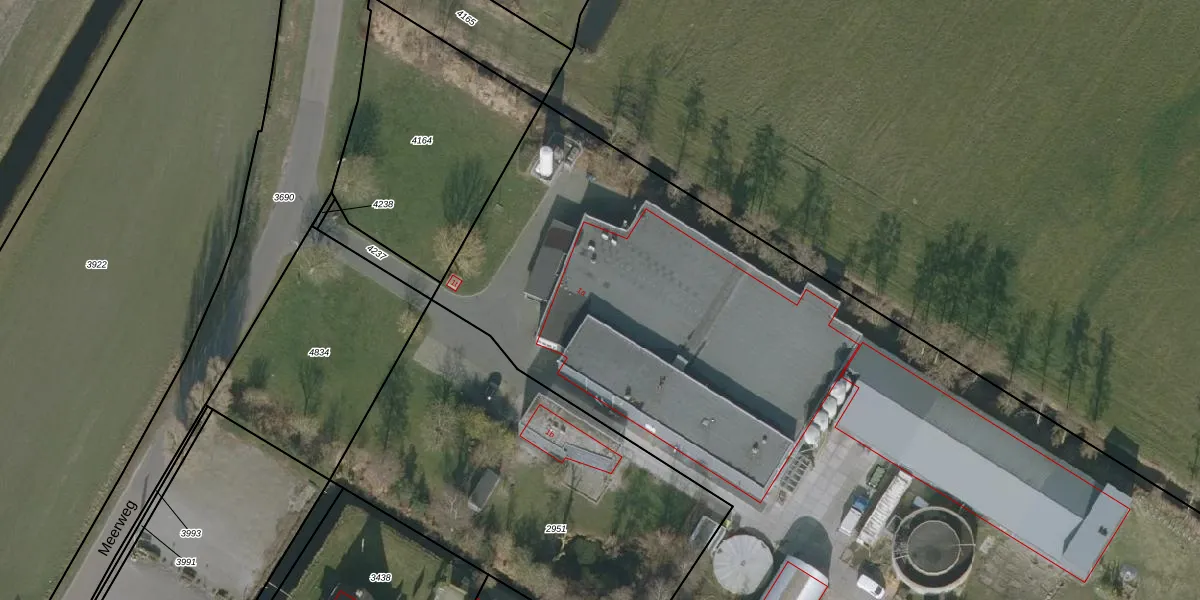 Het perceel waarop Meerweg 1-a staat heeft een oppervlakte van 1,2 ha. Dit is een zeer groot perceel. De perceeloppervlakte wordt geregistreerd door het Kadaster. Gedetailleerde informatie over de maten van dit perceel kunt u vinden in het rapport Kadastrale kaart met maatvoering van Meerweg 1-a.
