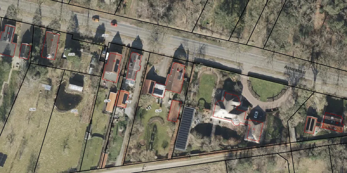 Asserstraat 33 is gelegen op kadastraal perceel RDE00V1248. Deze kadastrale aanduiding is uniek en wordt gebruikt door het Kadaster om eigendomsrechten en andere zakelijke rechten vast te leggen. Het perceel maakt onderdeel uit van de kadastrale gemeente Rolde.