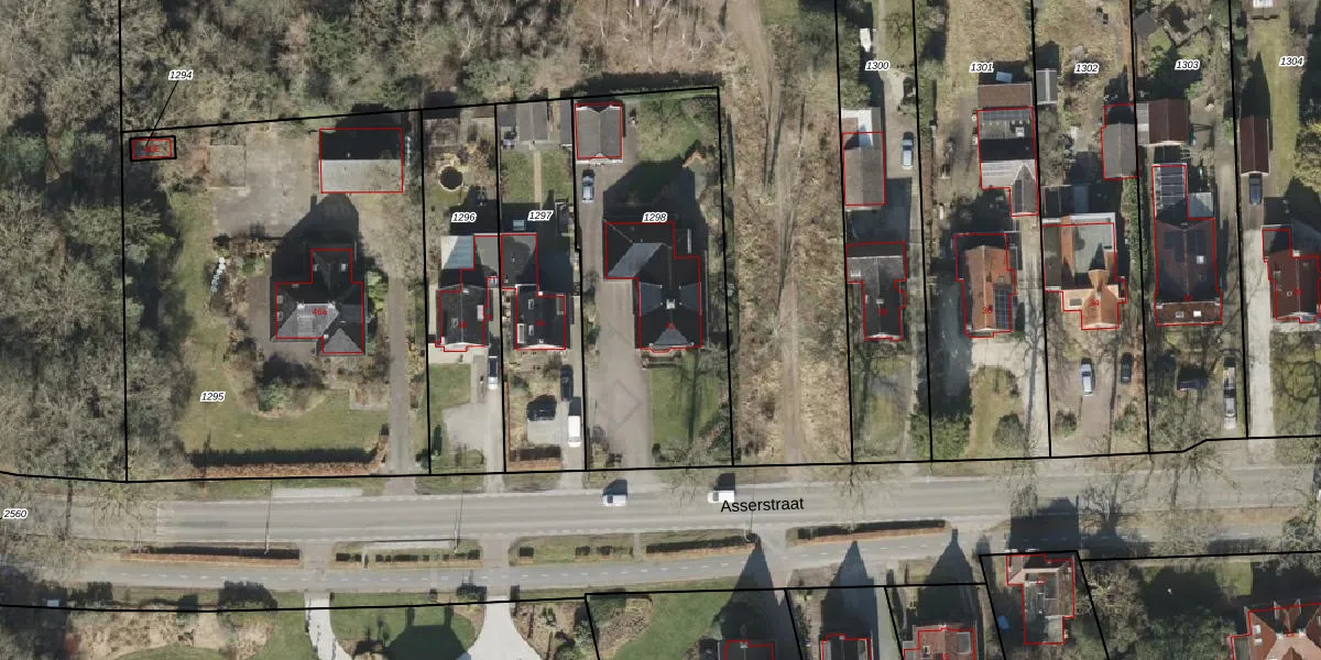 Het perceel waarop Asserstraat 42 staat heeft een oppervlakte van 1250 m². Dit is een zeer groot perceel. De perceeloppervlakte wordt geregistreerd door het Kadaster. Gedetailleerde informatie over de maten van dit perceel kunt u vinden in het rapport Kadastrale kaart met maatvoering van Asserstraat 42.