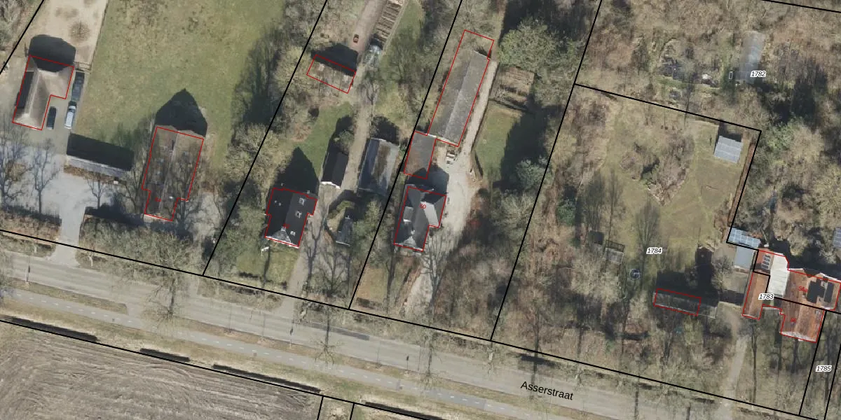 Het perceel waarop Asserstraat 60 staat heeft een oppervlakte van 5448 m². Dit is een zeer groot perceel. De perceeloppervlakte wordt geregistreerd door het Kadaster. Gedetailleerde informatie over de maten van dit perceel kunt u vinden in het rapport Kadastrale kaart met maatvoering van Asserstraat 60.