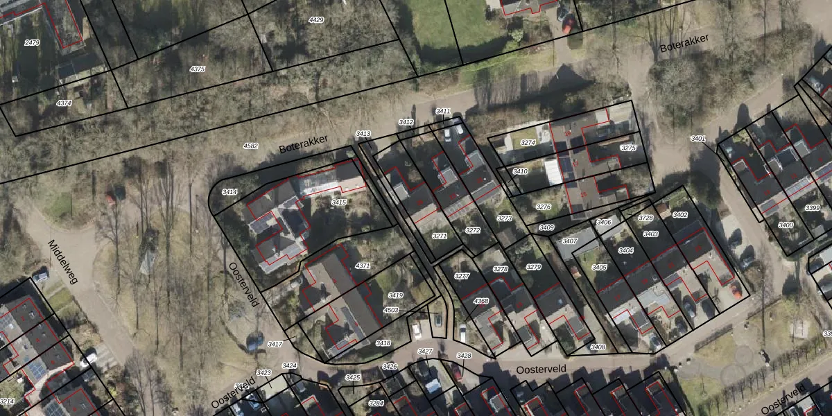 Het perceel waarop Boterakker 25 staat heeft een oppervlakte van 222 m². Dit is een middelgroot perceel. De perceeloppervlakte wordt geregistreerd door het Kadaster. Gedetailleerde informatie over de maten van dit perceel kunt u vinden in het rapport Kadastrale kaart met maatvoering van Boterakker 25.