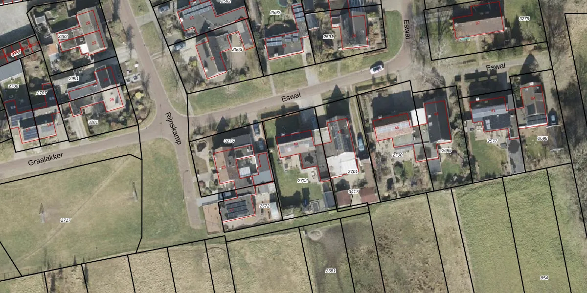 Eswal 49 is gelegen op kadastraal perceel RDE00L2702. Deze kadastrale aanduiding is uniek en wordt gebruikt door het Kadaster om eigendomsrechten en andere zakelijke rechten vast te leggen. Het perceel maakt onderdeel uit van de kadastrale gemeente Rolde.