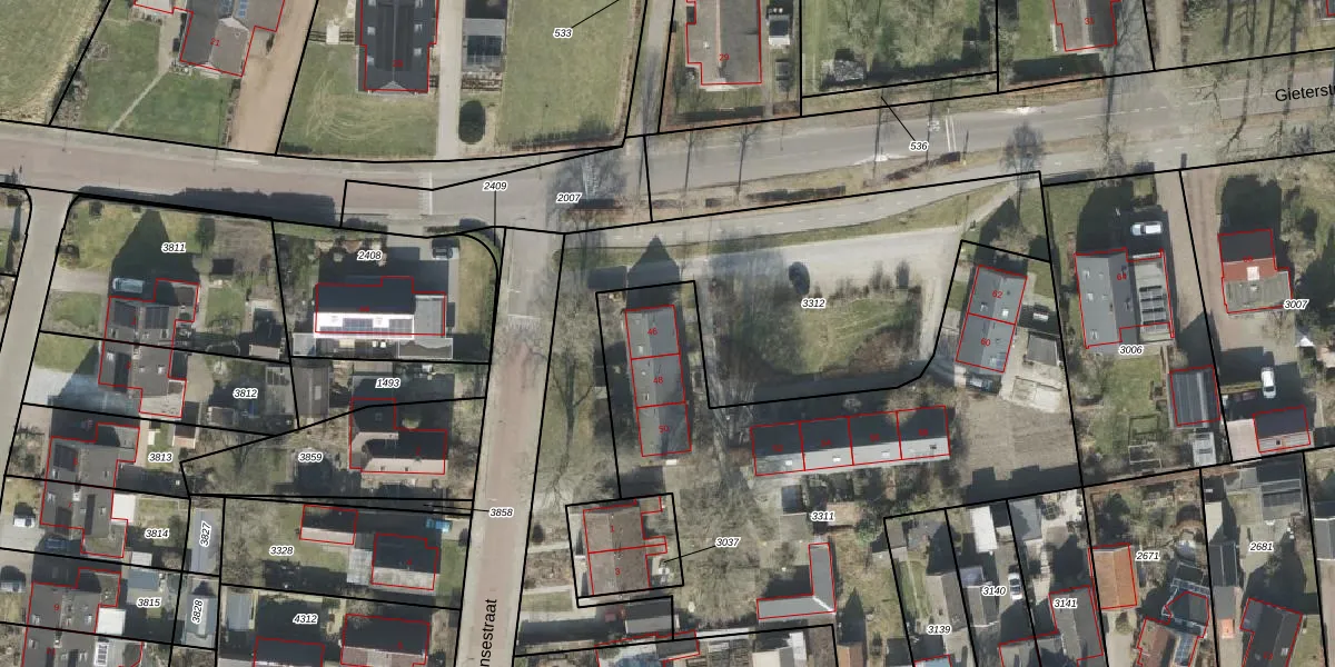 Gieterstraat 46 is gelegen op kadastraal perceel RDE00L3311. Deze kadastrale aanduiding is uniek en wordt gebruikt door het Kadaster om eigendomsrechten en andere zakelijke rechten vast te leggen. Het perceel maakt onderdeel uit van de kadastrale gemeente Rolde.