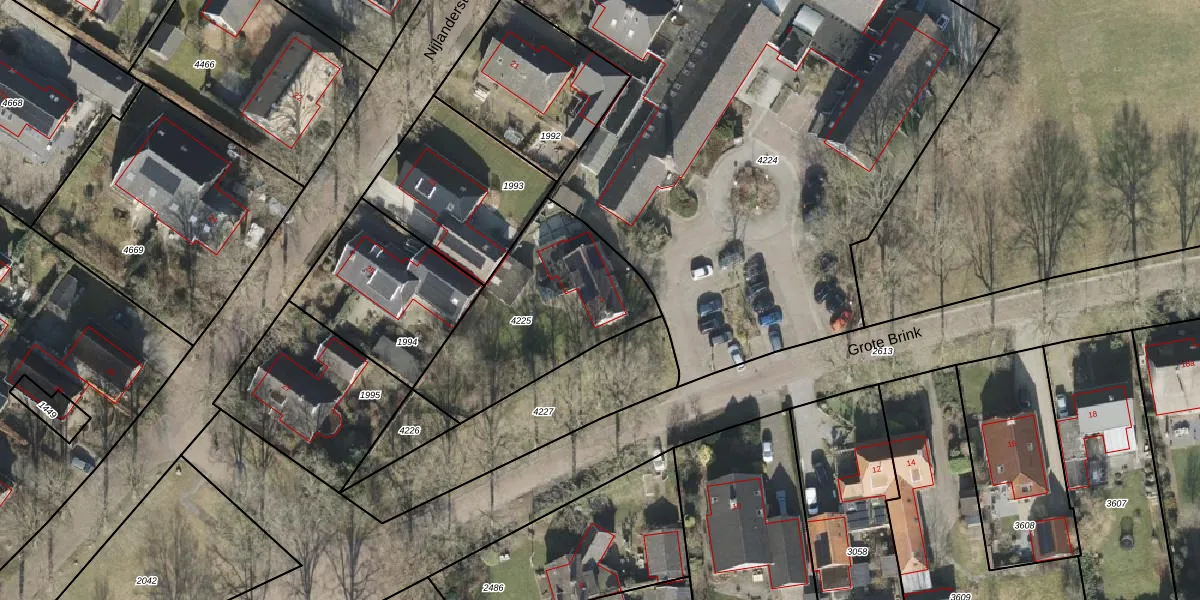 Grote Brink 1 is gelegen op kadastraal perceel RDE00R4225. Deze kadastrale aanduiding is uniek en wordt gebruikt door het Kadaster om eigendomsrechten en andere zakelijke rechten vast te leggen. Het perceel maakt onderdeel uit van de kadastrale gemeente Rolde.