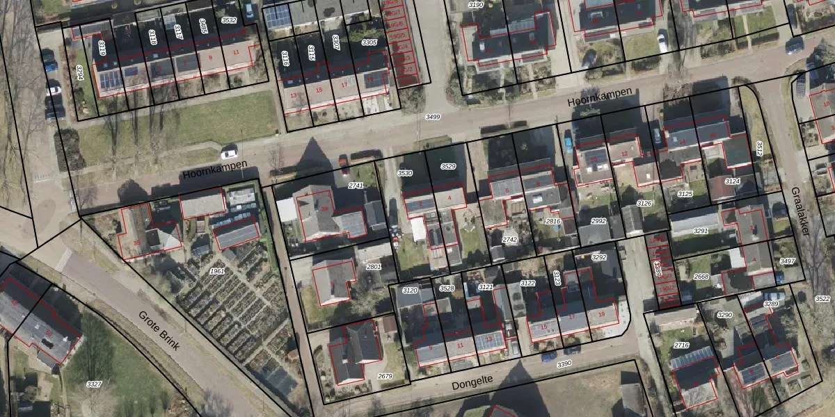 Het perceel waarop Hoornkampen 2 staat heeft een oppervlakte van 378 m². Dit is een groot perceel. De perceeloppervlakte wordt geregistreerd door het Kadaster. Gedetailleerde informatie over de maten van dit perceel kunt u vinden in het rapport Kadastrale kaart met maatvoering van Hoornkampen 2.