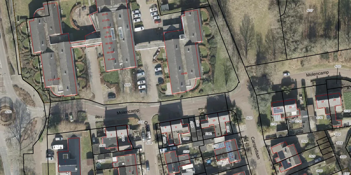 Molencamp 43 is gelegen op kadastraal perceel RDE00R4055. Deze kadastrale aanduiding is uniek en wordt gebruikt door het Kadaster om eigendomsrechten en andere zakelijke rechten vast te leggen. Het perceel maakt onderdeel uit van de kadastrale gemeente Rolde.