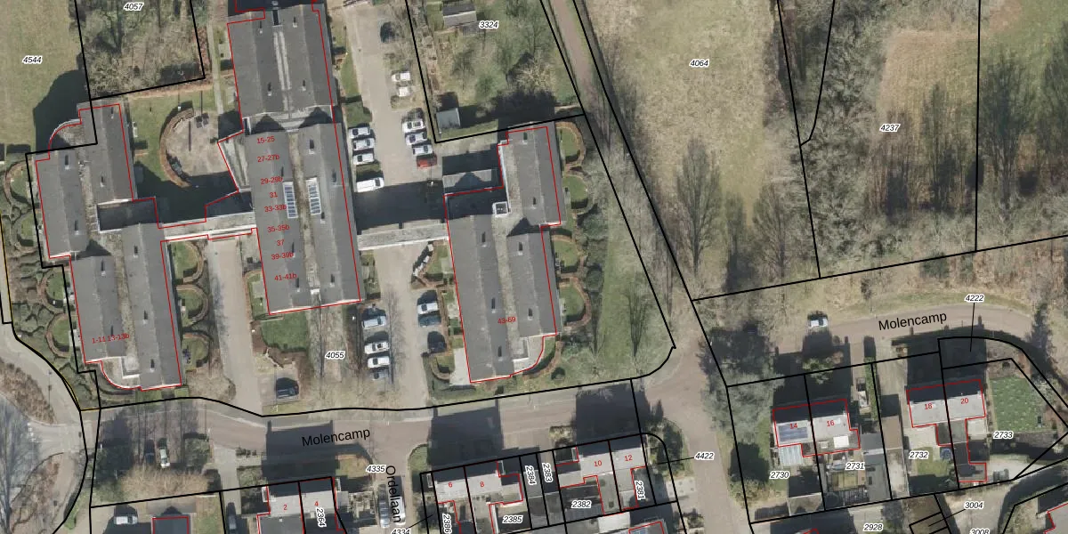 Het perceel waarop Molencamp 61 staat heeft een oppervlakte van 6944 m². Dit is een zeer groot perceel. De perceeloppervlakte wordt geregistreerd door het Kadaster. Gedetailleerde informatie over de maten van dit perceel kunt u vinden in het rapport Kadastrale kaart met maatvoering van Molencamp 61.