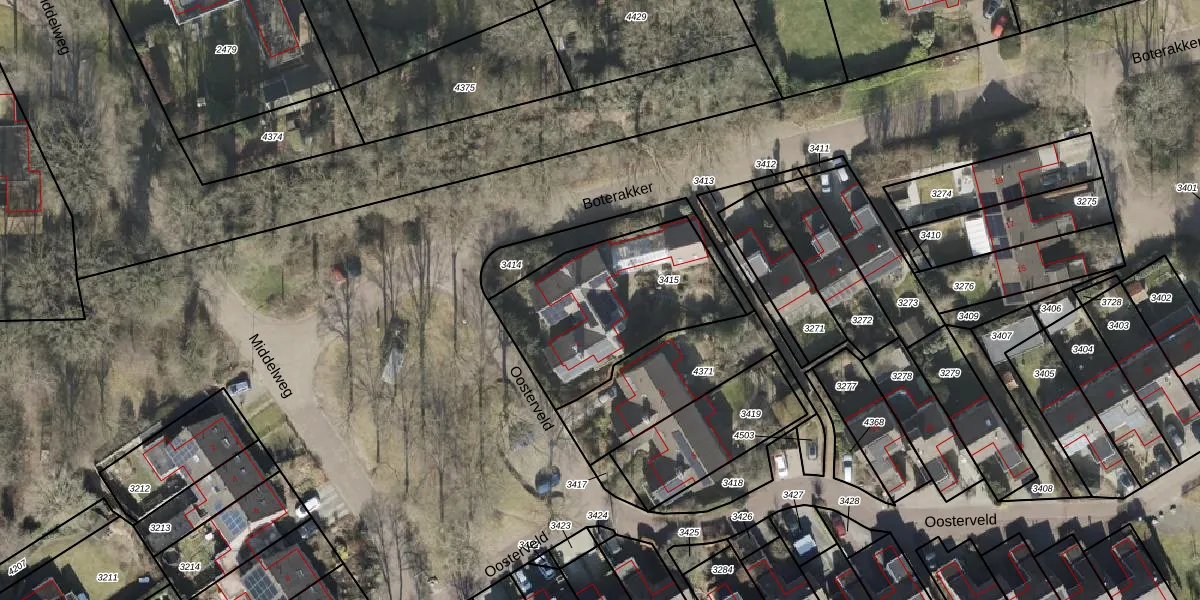 Het perceel waarop Oosterveld 1 staat heeft een oppervlakte van 710 m². Dit is een groot perceel. De perceeloppervlakte wordt geregistreerd door het Kadaster. Gedetailleerde informatie over de maten van dit perceel kunt u vinden in het rapport Kadastrale kaart met maatvoering van Oosterveld 1.