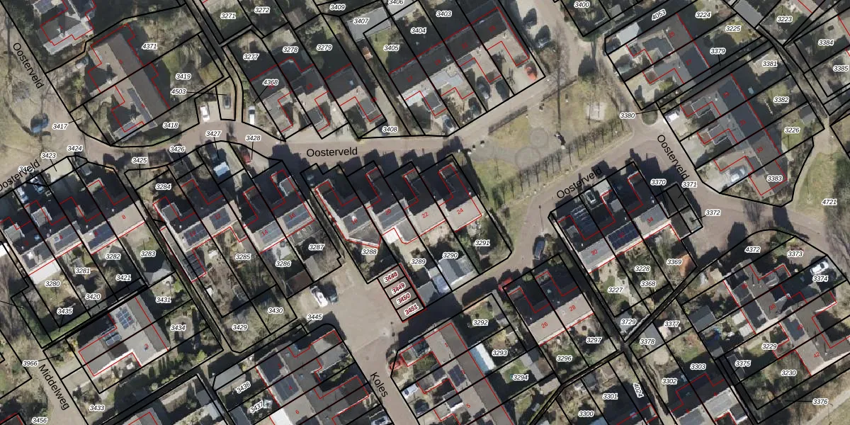 Oosterveld 22 is gelegen op kadastraal perceel RDE00R3290. Deze kadastrale aanduiding is uniek en wordt gebruikt door het Kadaster om eigendomsrechten en andere zakelijke rechten vast te leggen. Het perceel maakt onderdeel uit van de kadastrale gemeente Rolde.