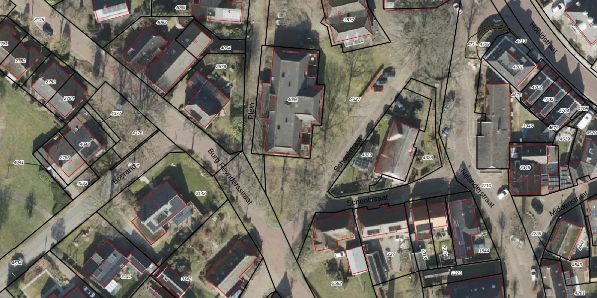 Plein 1 is gelegen op kadastraal perceel RDE00R4096. Deze kadastrale aanduiding is uniek en wordt gebruikt door het Kadaster om eigendomsrechten en andere zakelijke rechten vast te leggen. Het perceel maakt onderdeel uit van de kadastrale gemeente Rolde.