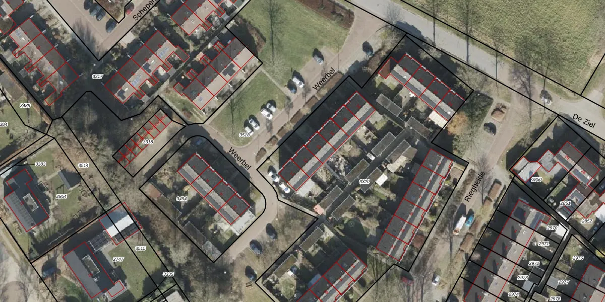 Het perceel waarop Weerbel 12 staat heeft een oppervlakte van 3935 m². Dit is een zeer groot perceel. De perceeloppervlakte wordt geregistreerd door het Kadaster. Gedetailleerde informatie over de maten van dit perceel kunt u vinden in het rapport Kadastrale kaart met maatvoering van Weerbel 12.