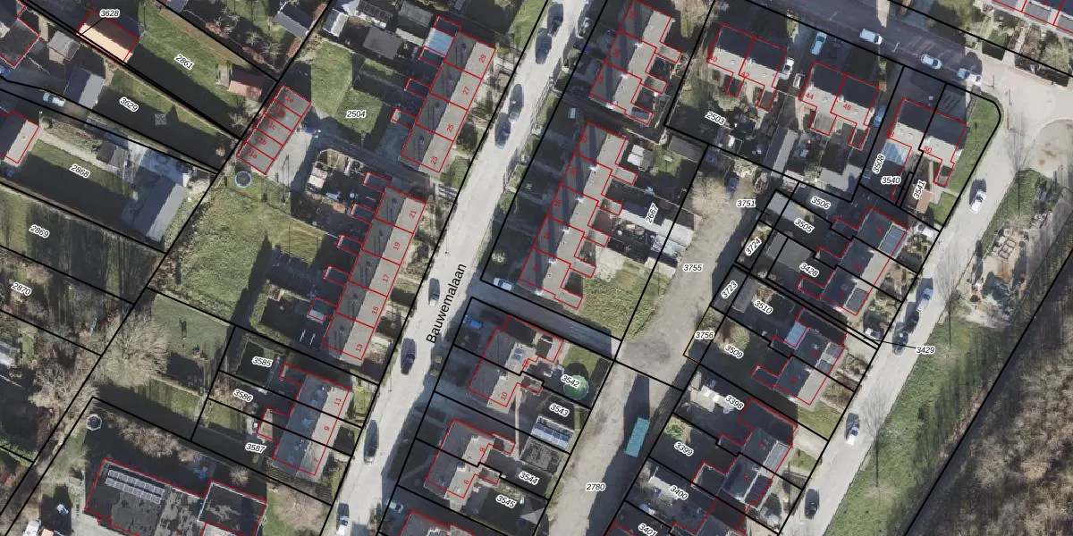 Het perceel waarop Bauwemalaan 14 staat heeft een oppervlakte van 1660 m². Dit is een zeer groot perceel. De perceeloppervlakte wordt geregistreerd door het Kadaster. Gedetailleerde informatie over de maten van dit perceel kunt u vinden in het rapport Kadastrale kaart met maatvoering van Bauwemalaan 14.