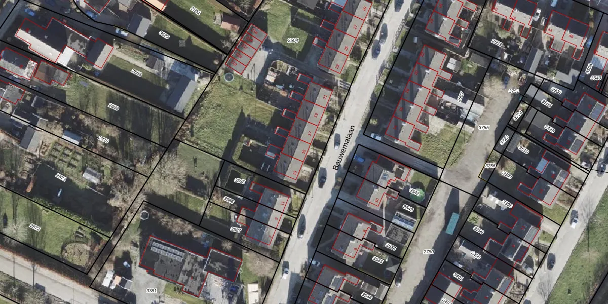 Het perceel waarop Bauwemalaan 15 staat heeft een oppervlakte van 3611 m². Dit is een zeer groot perceel. De perceeloppervlakte wordt geregistreerd door het Kadaster. Gedetailleerde informatie over de maten van dit perceel kunt u vinden in het rapport Kadastrale kaart met maatvoering van Bauwemalaan 15.