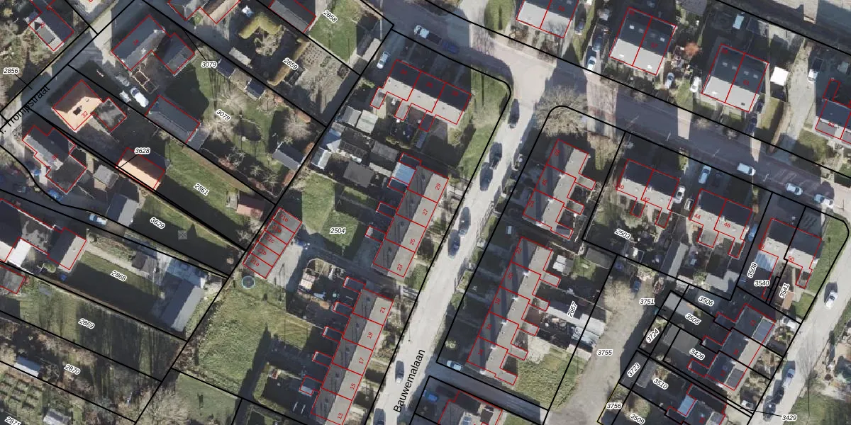 Het perceel waarop Bauwemalaan 27 staat heeft een oppervlakte van 3611 m². Dit is een zeer groot perceel. De perceeloppervlakte wordt geregistreerd door het Kadaster. Gedetailleerde informatie over de maten van dit perceel kunt u vinden in het rapport Kadastrale kaart met maatvoering van Bauwemalaan 27.