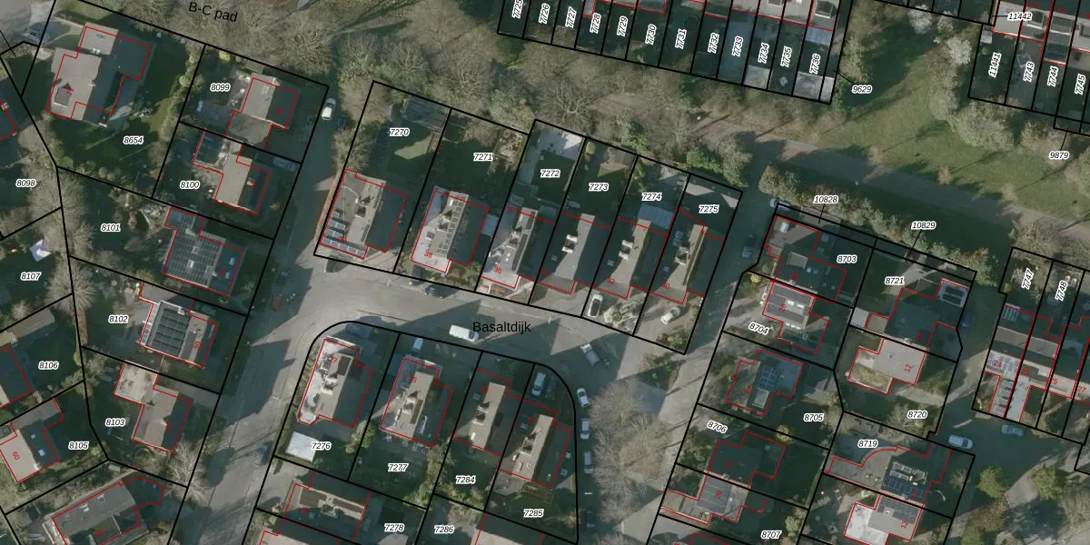 Het perceel waarop Basaltdijk 34 staat heeft een oppervlakte van 319 m². Dit is een groot perceel. De perceeloppervlakte wordt geregistreerd door het Kadaster. Gedetailleerde informatie over de maten van dit perceel kunt u vinden in het rapport Kadastrale kaart met maatvoering van Basaltdijk 34.