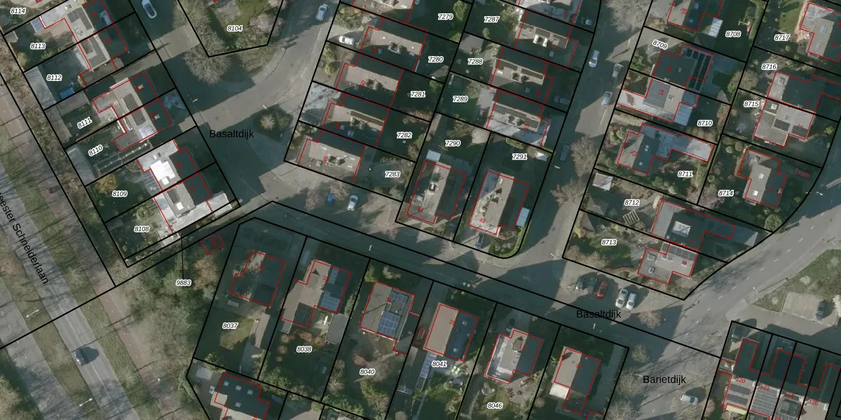 Het perceel waarop Basaltdijk 44 staat heeft een oppervlakte van 405 m². Dit is een groot perceel. De perceeloppervlakte wordt geregistreerd door het Kadaster. Gedetailleerde informatie over de maten van dit perceel kunt u vinden in het rapport Kadastrale kaart met maatvoering van Basaltdijk 44.