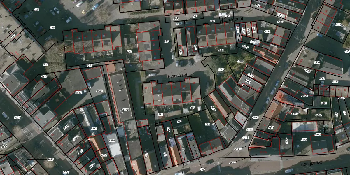 Eindstraat 34 is gelegen op kadastraal perceel RSD00O185. Deze kadastrale aanduiding is uniek en wordt gebruikt door het Kadaster om eigendomsrechten en andere zakelijke rechten vast te leggen. Het perceel maakt onderdeel uit van de kadastrale gemeente Roosendaal en Nispen.