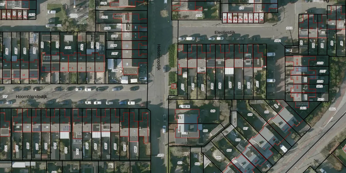 Het perceel waarop Heliotroopdijk 4-a staat heeft een oppervlakte van 8738 m². Dit is een zeer groot perceel. De perceeloppervlakte wordt geregistreerd door het Kadaster. Gedetailleerde informatie over de maten van dit perceel kunt u vinden in het rapport Kadastrale kaart met maatvoering van Heliotroopdijk 4-a.