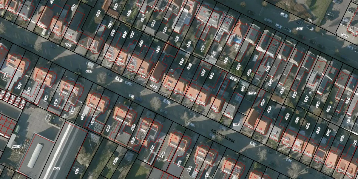 Het perceel waarop Middenstraat 47 staat heeft een oppervlakte van 185 m². Dit is een middelgroot perceel. De perceeloppervlakte wordt geregistreerd door het Kadaster. Gedetailleerde informatie over de maten van dit perceel kunt u vinden in het rapport Kadastrale kaart met maatvoering van Middenstraat 47.