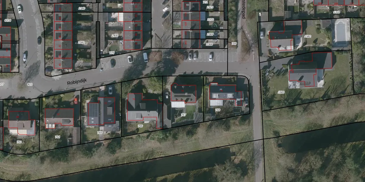Het perceel waarop Robijndijk 76 staat heeft een oppervlakte van 614 m². Dit is een groot perceel. De perceeloppervlakte wordt geregistreerd door het Kadaster. Gedetailleerde informatie over de maten van dit perceel kunt u vinden in het rapport Kadastrale kaart met maatvoering van Robijndijk 76.
