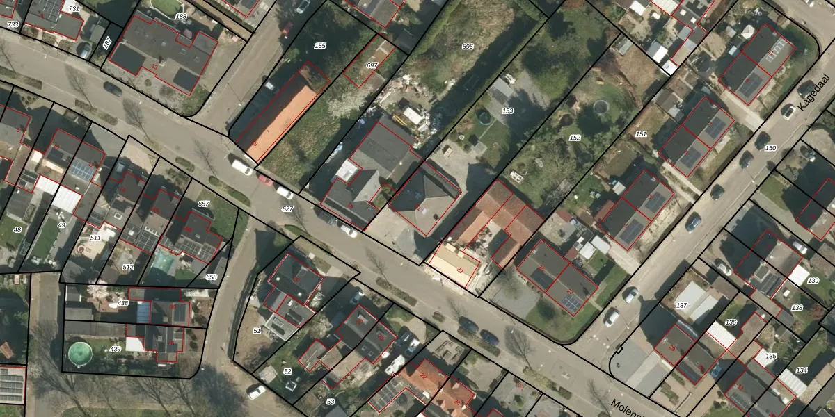 Het perceel waarop Molenstraat 21 staat heeft een oppervlakte van 1185 m². Dit is een zeer groot perceel. De perceeloppervlakte wordt geregistreerd door het Kadaster. Gedetailleerde informatie over de maten van dit perceel kunt u vinden in het rapport Kadastrale kaart met maatvoering van Molenstraat 21.