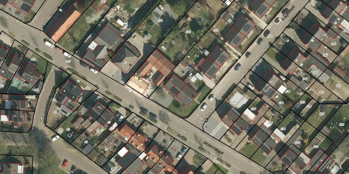 Het perceel waarop Molenstraat 25 staat heeft een oppervlakte van 2345 m². Dit is een zeer groot perceel. De perceeloppervlakte wordt geregistreerd door het Kadaster. Gedetailleerde informatie over de maten van dit perceel kunt u vinden in het rapport Kadastrale kaart met maatvoering van Molenstraat 25.
