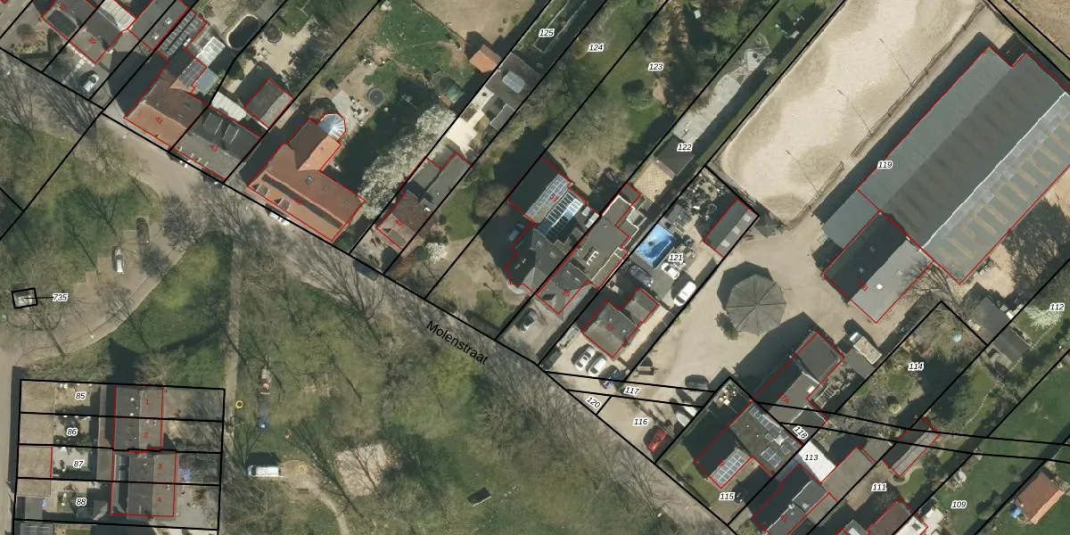 Het perceel waarop Molenstraat 53 staat heeft een oppervlakte van 1775 m². Dit is een zeer groot perceel. De perceeloppervlakte wordt geregistreerd door het Kadaster. Gedetailleerde informatie over de maten van dit perceel kunt u vinden in het rapport Kadastrale kaart met maatvoering van Molenstraat 53.